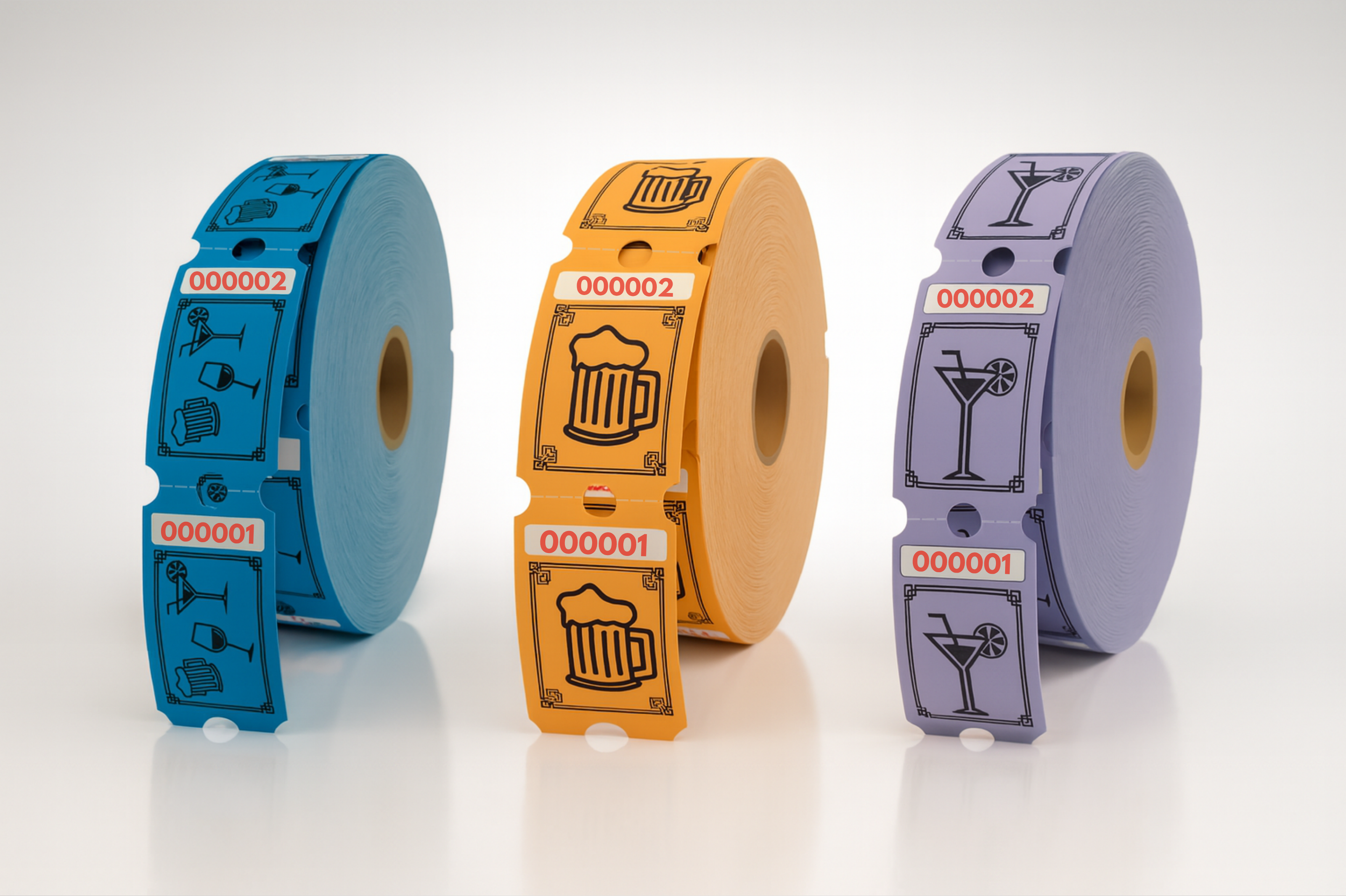 Nous proposons également des tickets d'entrée en rouleaux, ainsi que des tickets de boissons, tous deux livrés dans du papier 120 g/m² de haute qualité « sans bois ». Les billets de boissons et d’entrée peuvent également être personnalisés à votre guise avec du texte et des logos.